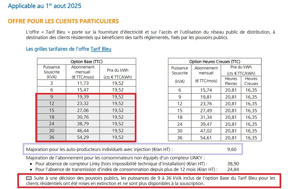 Du côté d'EDF on s'adapte, les abonnements "de base" pour une puissance supérieure ou égale à 9 KVA ne sont plus disponibles, il faut impérétivement prendre du "heures creuses" ou tempo