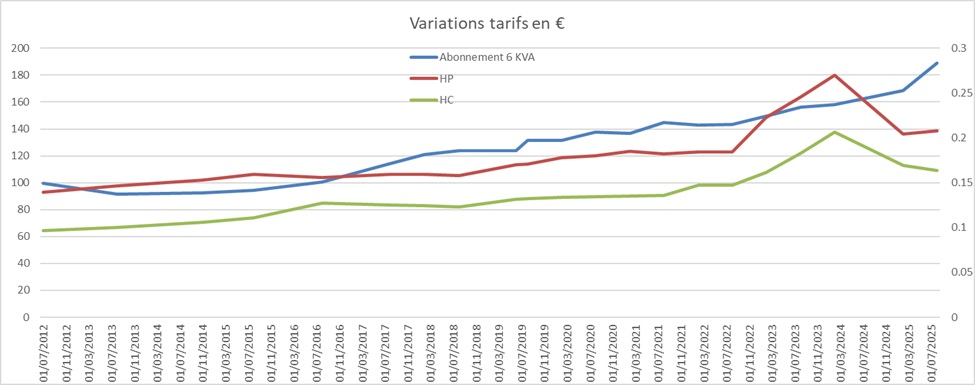 Notez que la forte baisse de février 2025 correspond à une correction de l'envolée des tarifs de ces dernières années à cause de l'ARENH (adossement des prix du KWh électrique sur le cours du marché européen et ce même si la production française avec le nucléaire produit une des énergies les moins chères au monde). Cependant, si cette baisse / correction était attendue et normale, cela aura été de courte durée.