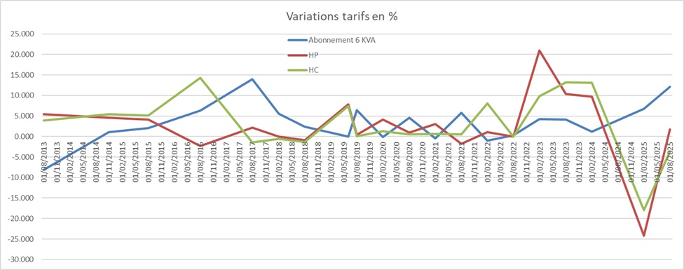 En terme d'augmentation (variation en %) voici ce que ça donne pour l'abonnement 6 KVA ainsi que les prix TTC HP/HC