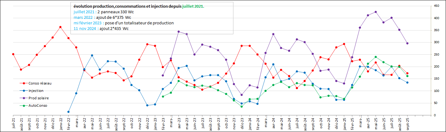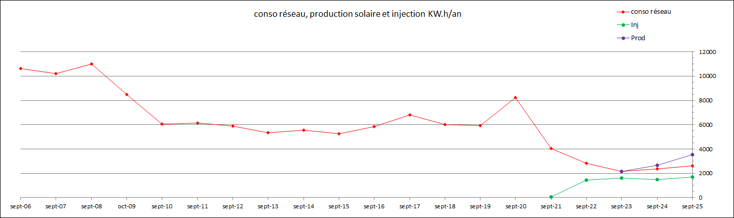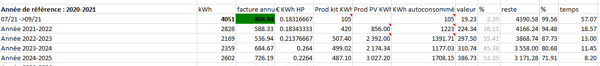Pour ce qui est de l'amortissement des installations de production, un kit solaire de 2*330 Wc acheté 1200€ en 2021, puis la pose par mes soins de 6 panneaux de 375 Wc sur chassis bois en 2022 (+2400€) suivi d'une extension de 2*435 Wc en novembre 2024 (+750€) soit un cout initial de 4409€,