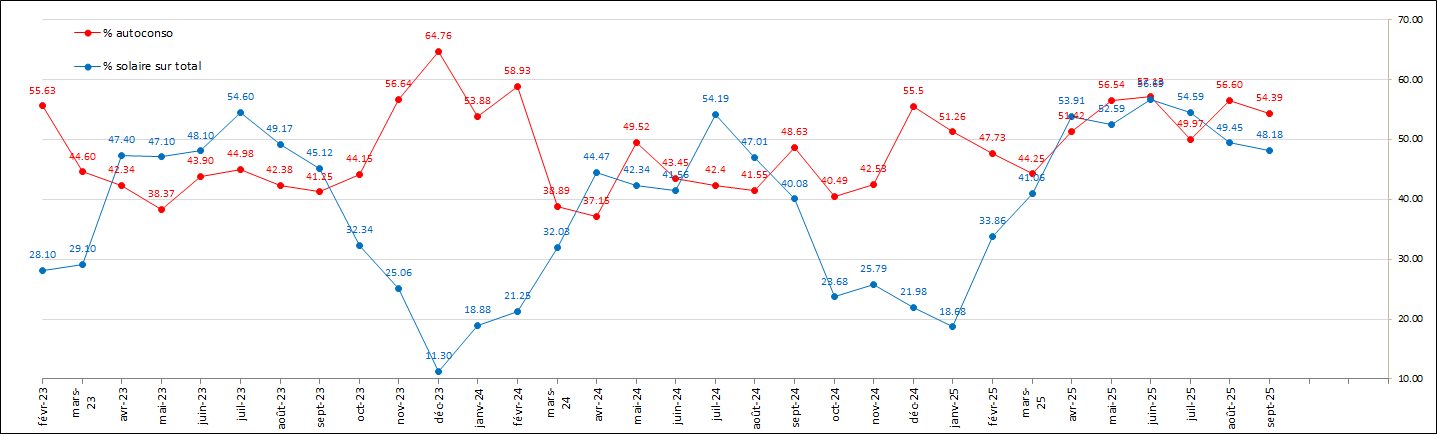 Nous avons fait en sorte d'encore améliorer notre autoconsommation (courbe verte).
