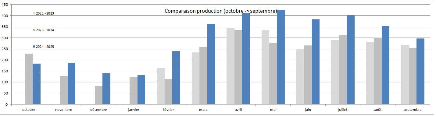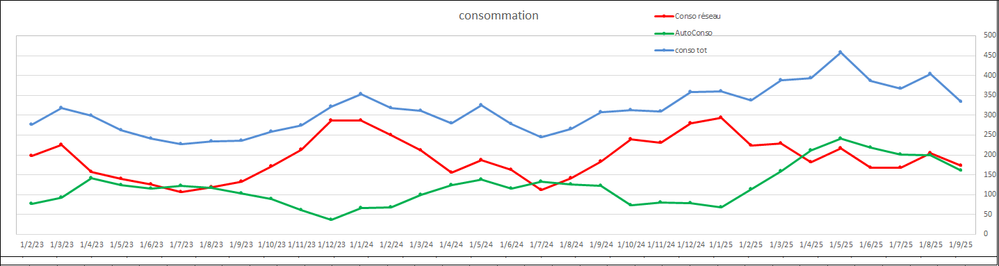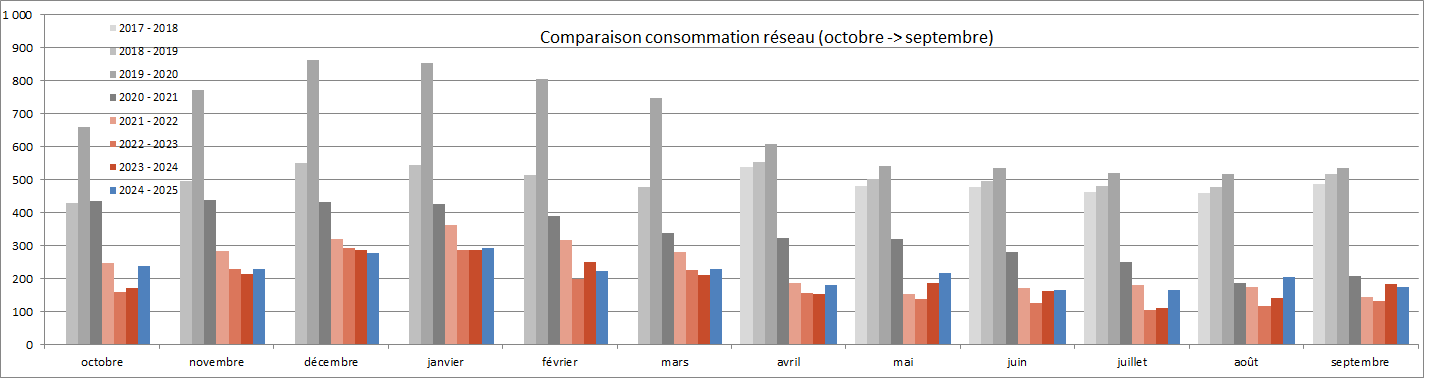 Le fait d'avoir été 3 adultes à la maison au lieu de 2 sur une période de 5.5 mois, a bien évidemment eu une incidence avec une consommation totale en augmentation de 10% par rapport à l'année 2023-2024