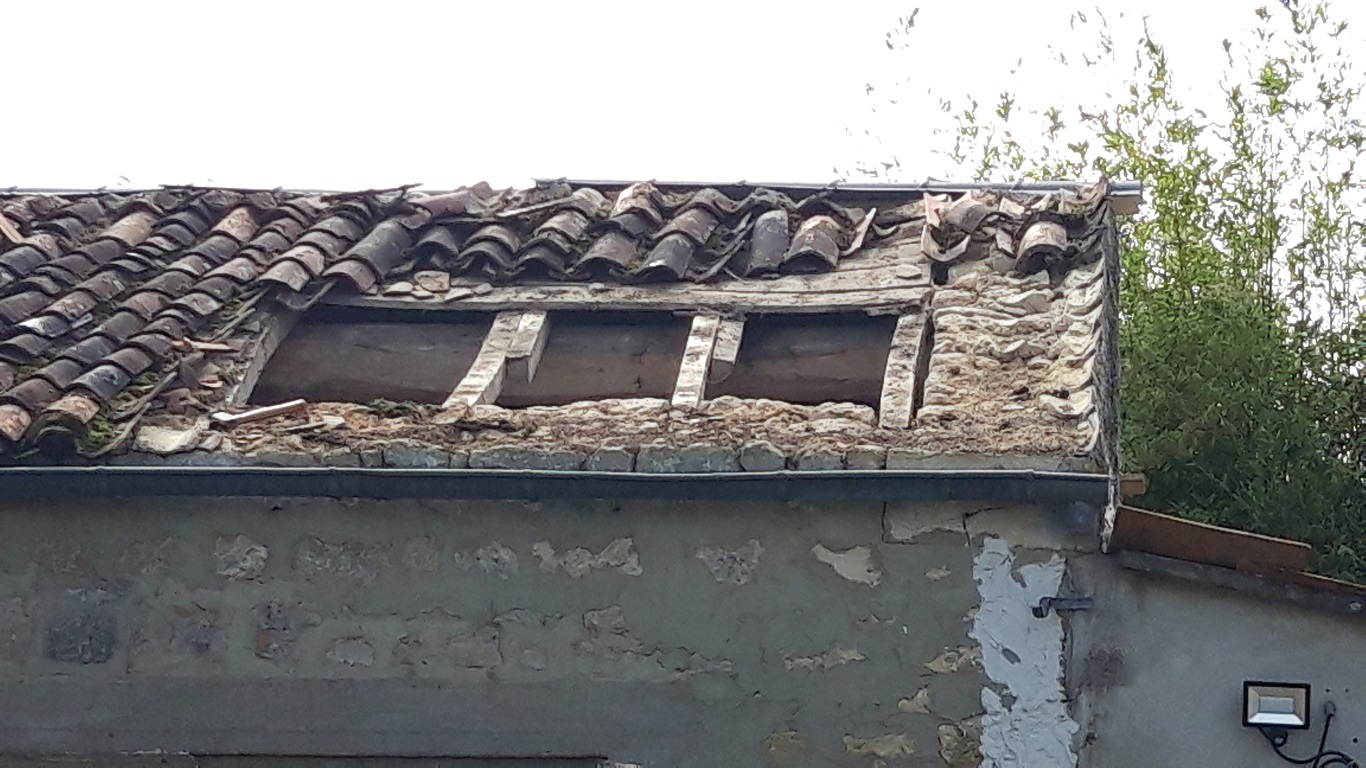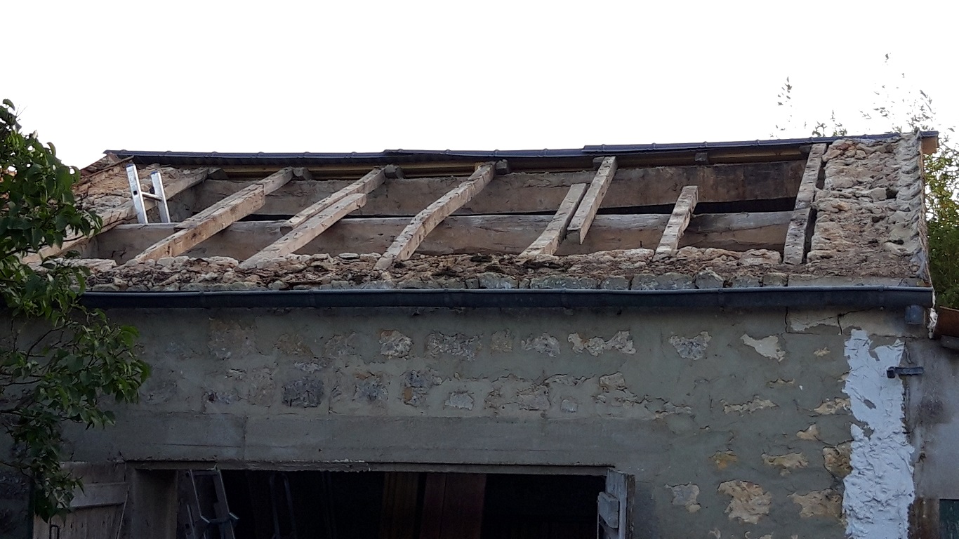 Ce matin je ne pouvais pas travailler pour cause de rdv. Cet après-midi j'ai remplacé un chevron, déposé 1 tôle faitière (elles étaient posées pour l''étancheité mais pas alignées correctement), fixé les éléments de charpente et ... c'est a peu près tout. Impossible d'aller plus loin harcelé par des guêpes.